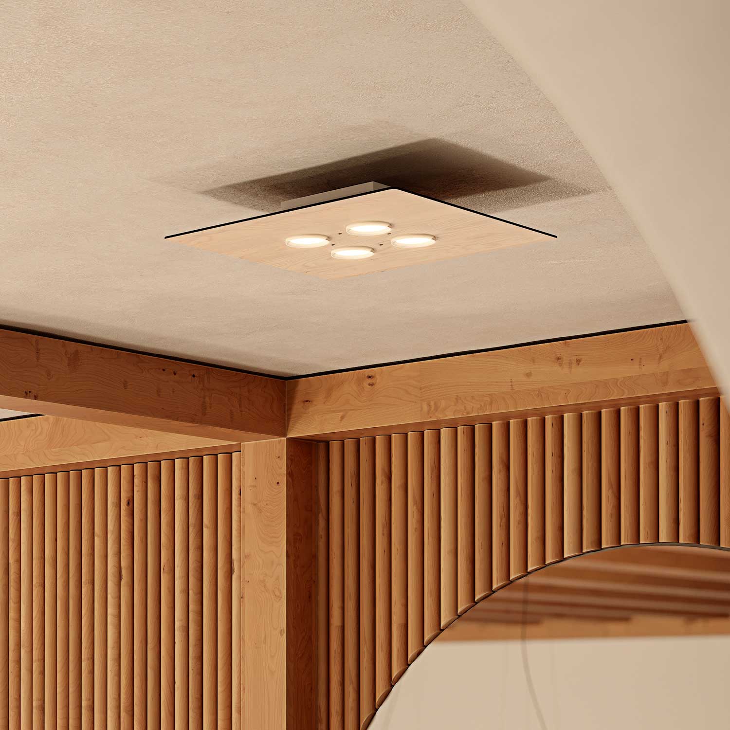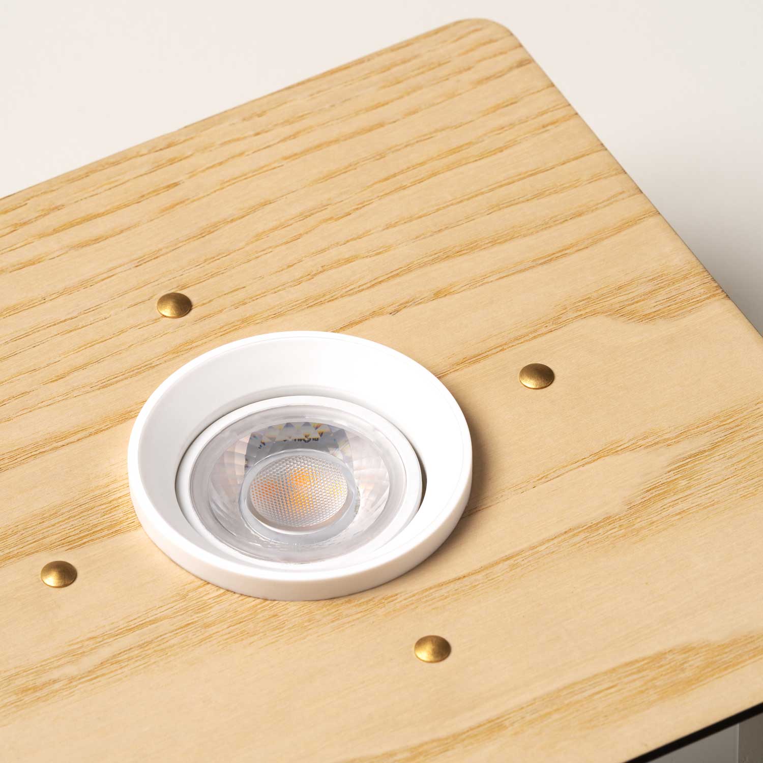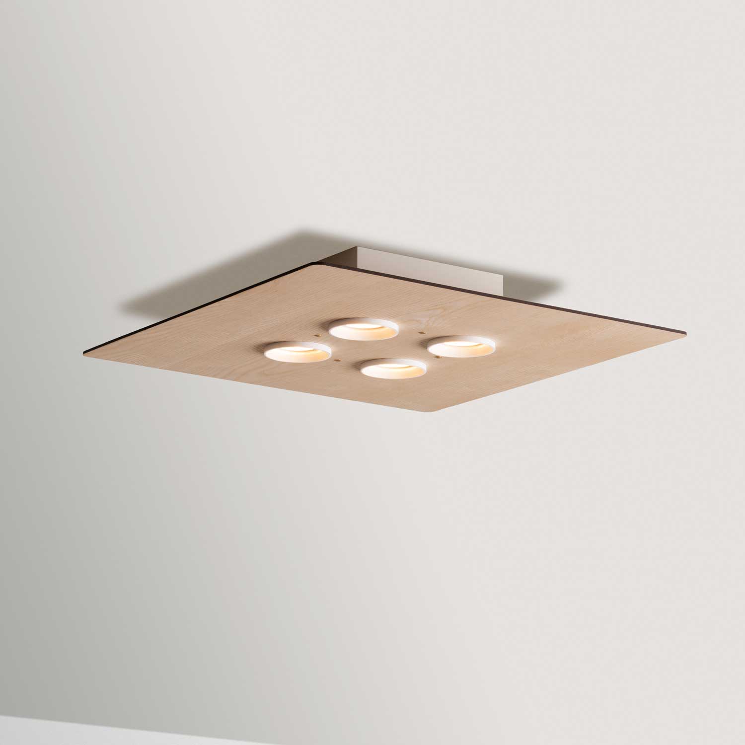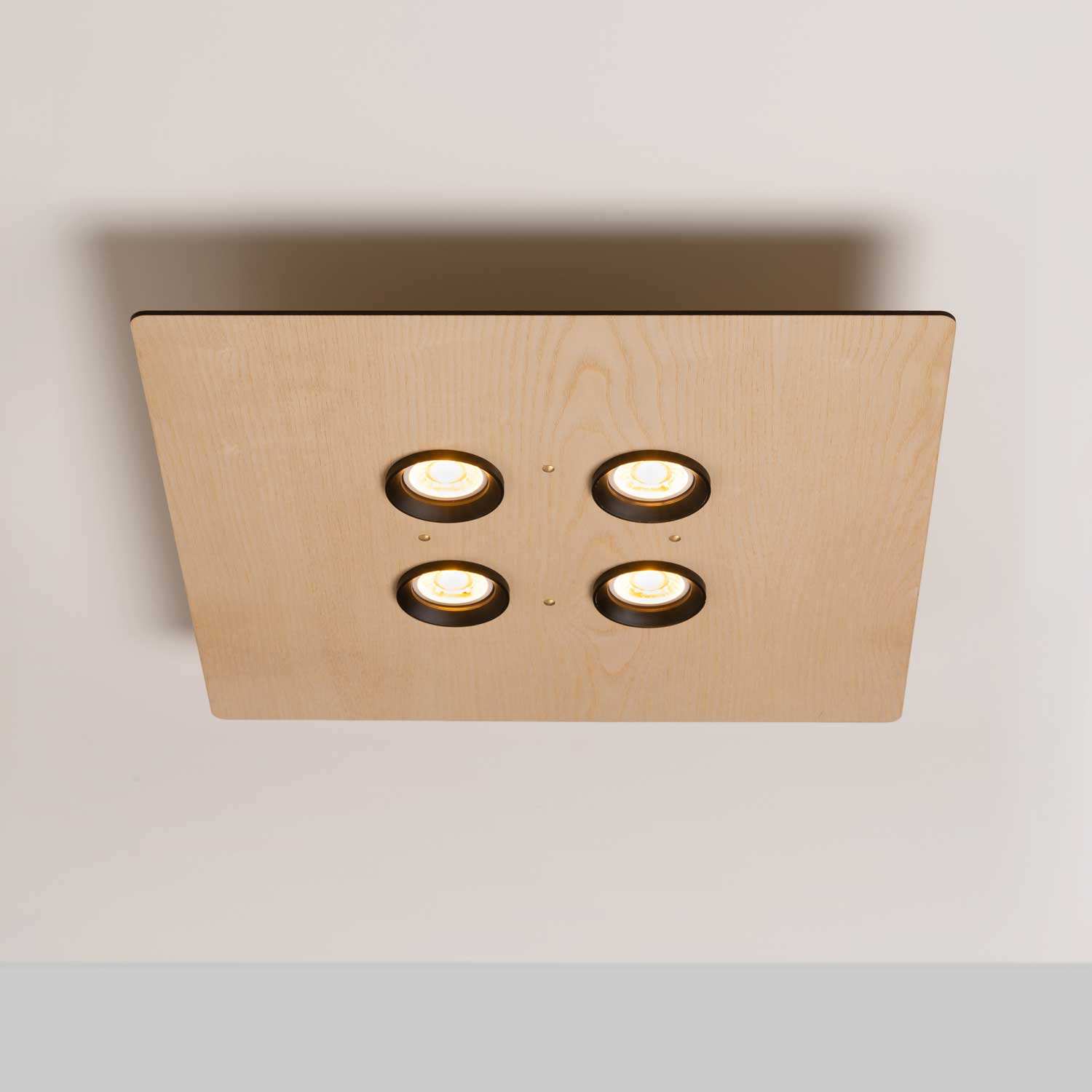Deckenleuchte aus mundgeblasenem weißen Opalglas mit weiss lackiertem Stahl und Eschenholz, Dimmbarkeit vom verwendeten Leuchtmittel abhängig, 4 x Fassung GU10 maximale Belastbarkeit 8 Watt, Hochvolt-Leuchte, Schutzklasse 20 (Staub und Nässe), Schutzklasse I (Schutz gegen Stromstösse), darf auf normalerweise brennbaren Oberflächen montiert werden, Farbwiedergabeindex hängt vom verwendeten Leuchtmittel ab, Energieeffizienzklasse hängt vom verwendeten Leuchtmittel ab, Höhe 75 mm, Breite 450 mm, Tiefe 450 mm, Energieeffizienzklasse F, 1 Karton (50 x 50 x 14,5 cm), Versandgewicht 5 kg, exklusive GU10 Leuchtmittel