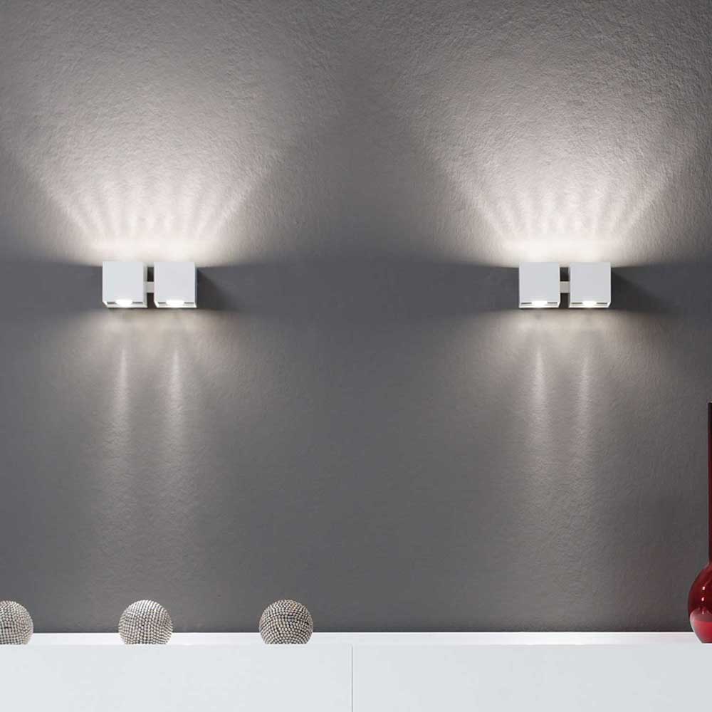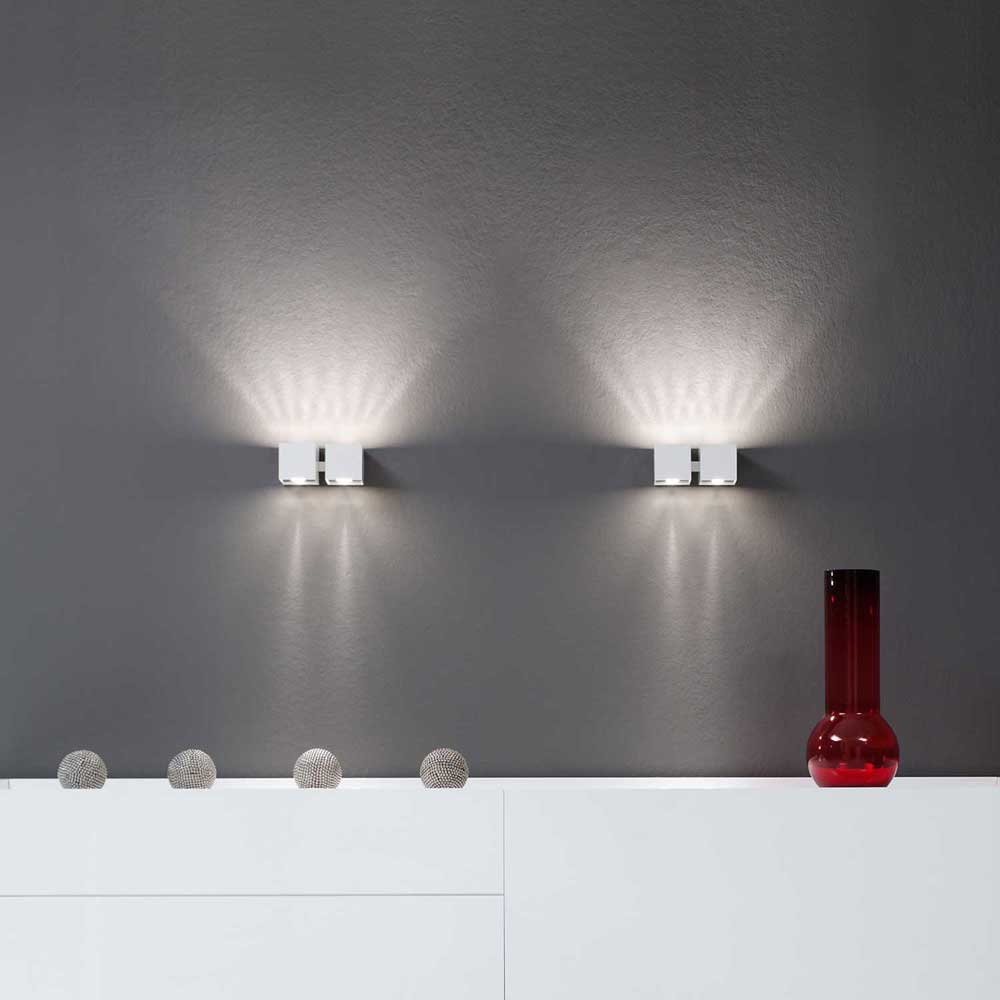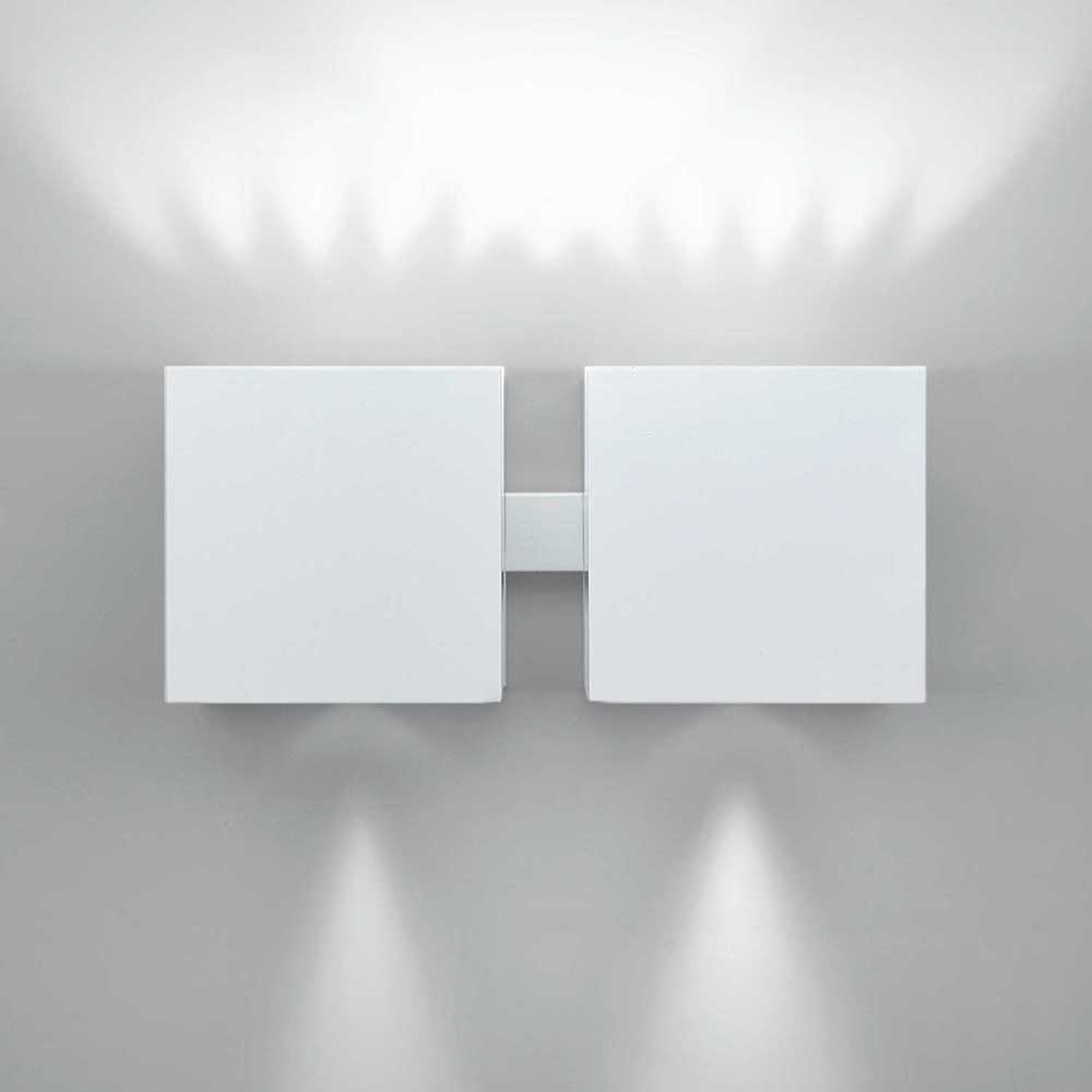 Wandleuchte aus weiss lackiertem Aluminium mit verchromten Stahl, Dimmbarkeit vom verwendeten Leuchtmittel abhängig, Abstrahlwinkel hängt vom verwendeten Leuchtmittel ab, 2 x Hochvolt-Fassung G9 240V mit maximaler Belastbarkeit von 42 Watt, Hochvolt-Leuchte, Schutzklasse 20 (Staub und Nässe), Schutzklasse I (Schutz gegen Stromstösse), darf auf normalerweise brennbaren Oberflächen montiert werden, Farbwiedergabeindex hängt vom verwendeten Leuchtmittel ab, Energieeffizienzklasse hängt vom verwendeten Leuchtmittel ab, Höhe 80 mm, Breite 180 mm, Tiefe 101 mm, Ausladung von Decke, Wand oder Boden 101 mm, Energieeffizienzklasse E, 1 Karton (24,3 x 12,1 x 9,8 cm), Versandgewicht 1,1 kg, exklusive G9 Leuchtmittel