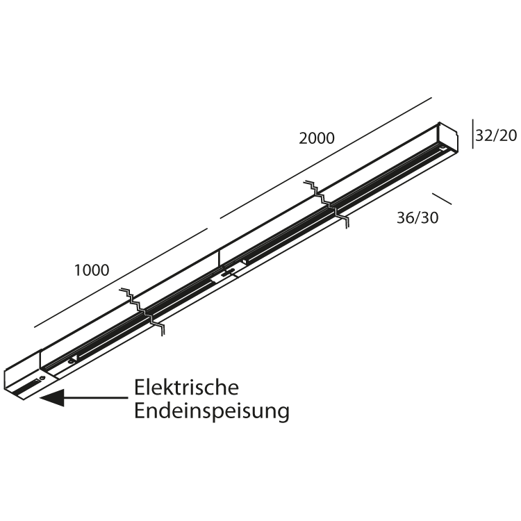 Set 3 Meter bestehend aus 3-Phasenschienen mit 1 und 2 Metern L„nge mit einer Endeinspeisung, elektrischem Verbinder und einer Endkappe in silber