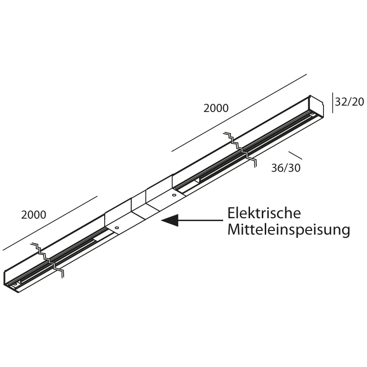 Set 4 Meter bestehend aus 3-Phasenschienen mit 2 und 2 Metern L„nge mit einer Mitteleinspeisung und zwei Endkappen in weiss